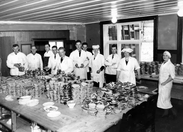 Fra Arbeidsløses Kafe i Rødfyllgaten 12 i Oslo først på 1930-tallet...Serveringen forberedes. Kafeen ble drevet av Oslo faglige..samorganisasjon 1929-1939.