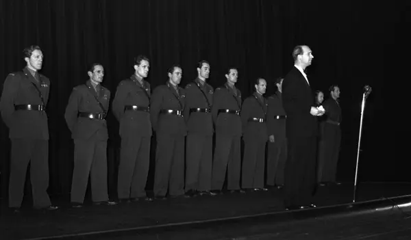 Forsvarsminister Jens Christian Hauge ønsker velkommen til premieren av filmen "Kampen om tungtvannet" på Klingenberg kino i Oslo. På scenen står veteraner fra kompani Linge. Fra v: Birger Strømsheim, Hans Storhaug, Kasper Idland, Knut Haukelid, Joachim Rønneberg, Jens Anton Poulsson, Arne Kjelstrup, Claus Helberg, Knut Haugland, Rolf Sørlie og Knut Lier-Hansen. Februar 1948.