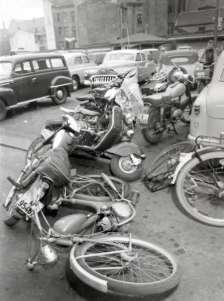 Opptøyer ved visning av filmen "Vend den ikke ryggen" - .Ungdom har satt fra seg sykler, mopeder, scooter og motorsykler utenfor Sentrum kino,.20. september 1956