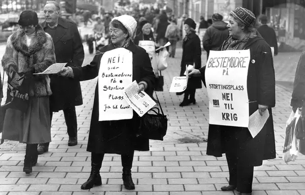 Bestemødrene på Stortingsplass demonstrerte hver onsdag klokken 12, i årene fra 1983 til 2003, mot atomvåpen og krig. Jenny Mosland (til ventre) og Mosse Jørgensen. November 1983