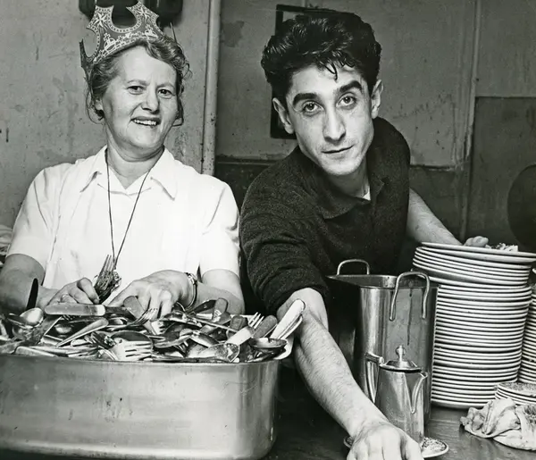 Restaurantpersonalets nyttårskveld. "Bestyrerinnen, fru Aslaug Korsmo ble kronet til kveldens dronning av sine mannlige kolleger i kjøkkenet på Regnbuen. Likevel ville hun rekke oppvaskgutten Henry Garcia fra Sevilla en hjelpende hånd." Nyttårsaften 1962. Januar 1963.
