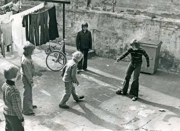 Gutter sparker fotball i en bakgård i Motzfeldts gate 26. Fra venstre: Jan Henrik Hamrebø, Espen Carlsen, Bjørn Erik Bakken, Jim Anders Aarmo og Johnny Sandem.mai 1975
