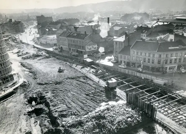 Saneringen av Vaterland. Området hvor Oslo Sentralstasjon og Postgirobygget ligger nå. Gateløpet som går på tvers av bildet er Vognmannsgata. .Foto september 1963.