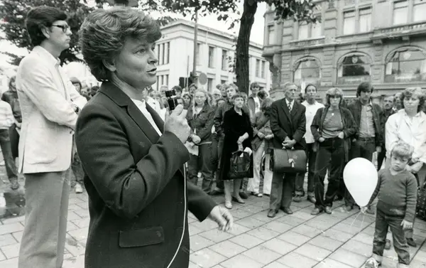 Gro Harlem Brundtland under stortingsvalgkampen 1981 i Studenterlunden på Karl Johans gate i Oslo. Bjørn Tore Godal til venstre. .Foto Joanna Butler. 7 september 1981.