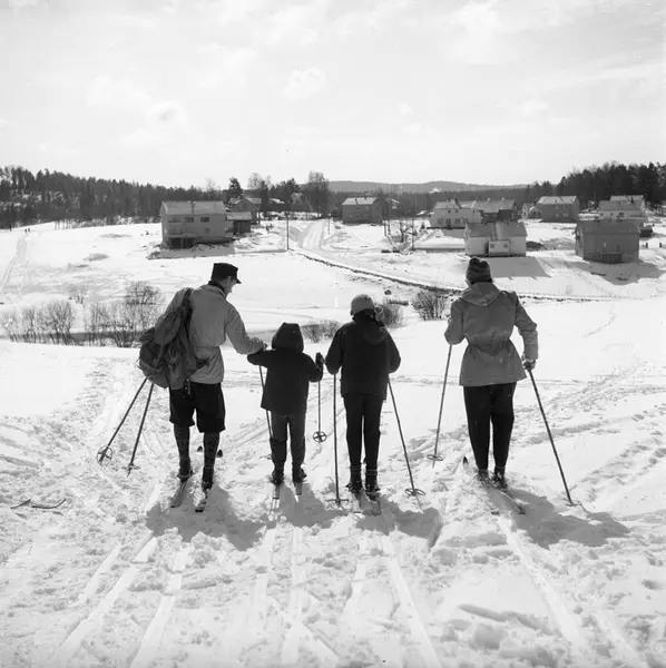 Skiløperne står litt nedenfor Østmarkveien der eldreboligene nå ligger. Det.er Østbyfaret vi ser med Ulsrudveien 40 (Gyving gård) på toppen. Ulsrud gård.ligger litt utenfor bildets venstre kant. Bekken i søkket er Ulsrudbekken..T-banen går nå i "dalbunnen"..1955.