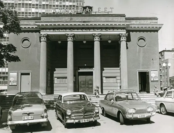 Parkerte biler utenfor Kino-Paléet ved Sørkedalsveien og Fridtjof Nansens vei. Plakat med filmen Covergirl-Mysteriet (Girl in the headlines) fra 1963. Kinoen ble revet 1964. Foto: Juni 1964.