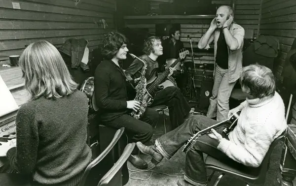 Club 7. Åkesons Road Band øver på klubbens musikerrom. Fra venstre: Turid Ormberg på piano, Carl (Calle) Magnus Neumann, Åge Røthe, Ole Jacob Hansen, Dag Åkeson Moe og Erik Wesseltoft. Desember 1979.