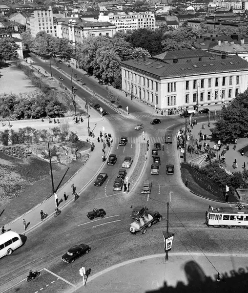 Området ved Frederiks gate, Drammensveien (nå Henrik Ibsens gate) og Karl Johans gate. Abelhaugen og Nisseberget til venstre. Deler av Studenterlunden til høyre. Universitetet. Mai 1950.