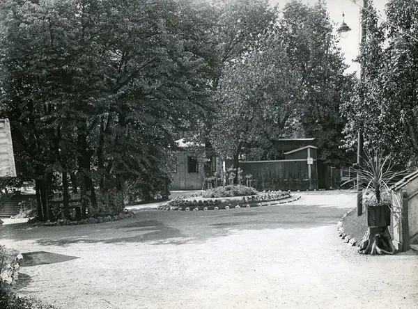 Parti fra hageanlegget i Tivoli. Tivoli hadde inngang hvor Stortingsgata og Klingenberggata ligger i dag. Til høyre i bildet henger en plakat som annonserer Edvard Munchs utstilling med Aula-dekorasjonene. .
