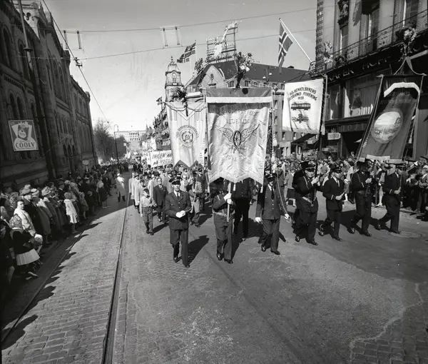 1. mai 1960 i Oslo.Karl Johans gate..Demonstrasjonstoget..Fane: Oslo Sporveis betjenings forening.Fane: Holmenkollbanens betjenings forening.Fane: Oslo Sporveisarbederes forening.Fane: Ekebergbanens betjenings forening...