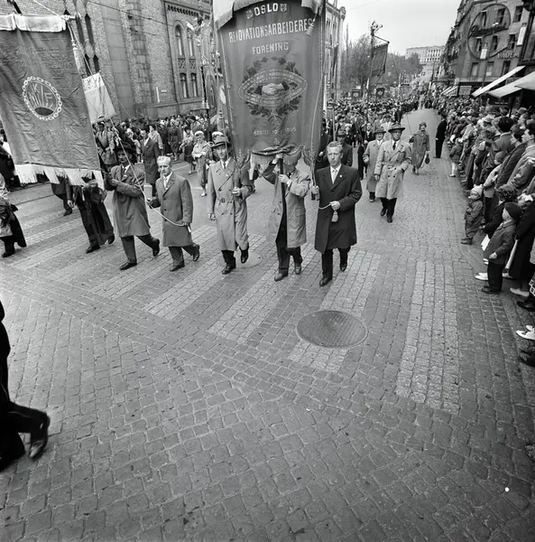 1. mai 1961 i Oslo.Demonstrasjonstoget på Karl Johans gate..Fane: Oslo Renovationsarbeidernes Forening.Fane: Oslo Kommunale Skolefunksjonærers Forening