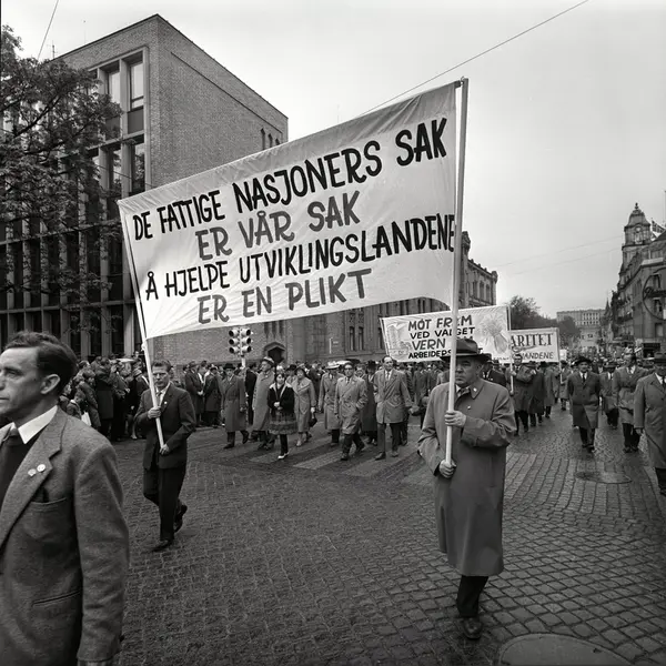 1. mai 1961 i Oslo.Demonstrasjonstoget på Karl Johans gate..Parole: De fattige nasjoners sak er vår sak.Å hjelpe utviklingslandene er vår plikt.Parole: Møt fram ved valget.Vern om arbeiderstyret..