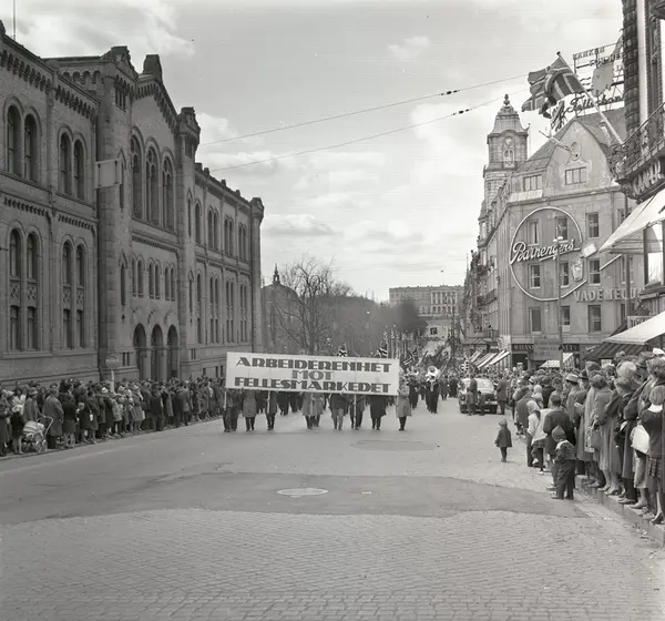 1. mai 1962 i Oslo.Demonstrasjonstog arrangert av "Faglig aksjon mot Fellesmarkedet" med støtte fra Sosialistisk Folkeparti (SF) og Norges kommunistiske parti (NKP)...Parole: Arbeiderenhet mot Fellesmarkedet