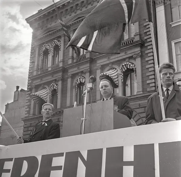 1. mai 1962 i Oslo.Demonstrasjonstog arrangert av "Faglig aksjon mot Fellesmarkedet" med støtte fra Sosialistisk Folkeparti (SF) og Norges kommunistiske parti (NKP)..Finn Kollerud fra Norsk Litograf- og Kjemigrafforbund, taler på Stortorvet.