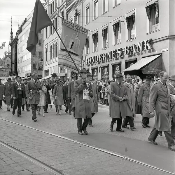 1. mai 1962 i Oslo.Demonstrasjonstog arrangert av "Faglig aksjon mot Fellesmarkedet" med støtte fra Sosialistisk Folkeparti (SF) og Norges kommunistiske parti (NKP)..Fane: Rørleggernes fagforening.