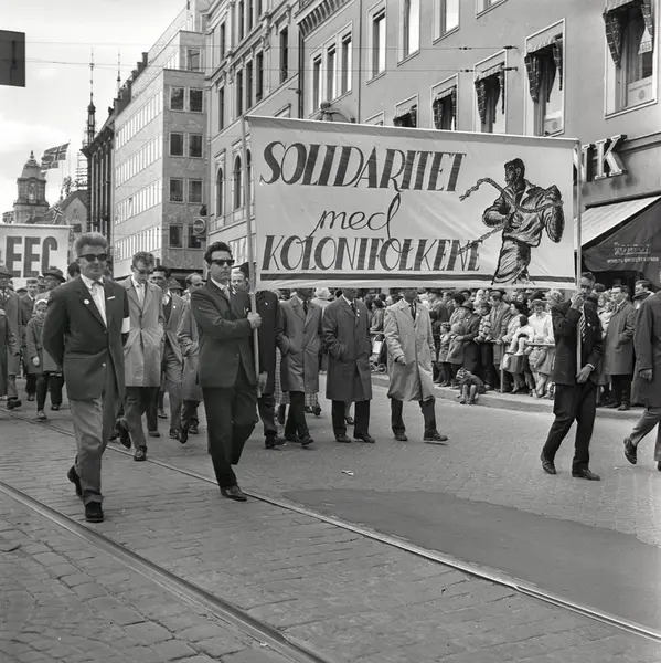 1. mai 1962 i Oslo.Demonstrasjonstog arrangert av "Faglig aksjon mot Fellesmarkedet" med støtte fra Sosialistisk Folkeparti (SF) og Norges kommunistiske parti (NKP)..Parole: Solidaritet med kolonifolket.