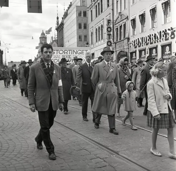 1. mai 1962 i Oslo.Demonstrasjonstog arrangert av "Faglig aksjon mot Fellesmarkedet" med støtte fra Sosialistisk Folkeparti (SF) og Norges kommunistiske parti (NKP)..Parole: Stortinget skal ikke trosse folkeviljen.
