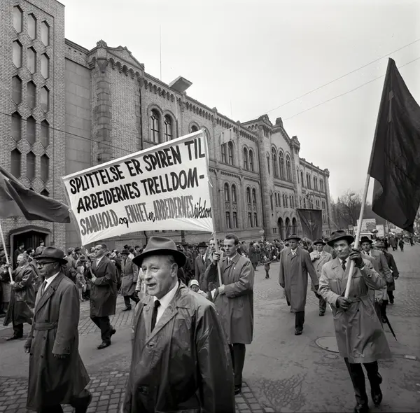 1. mai 1963 i Oslo.Demonstrasjonstoget i Karl Johans gate..Parole: Splittelse er spiren til arbeidernes trelldom.Samhold og enhet er arbeidernes rikdom
