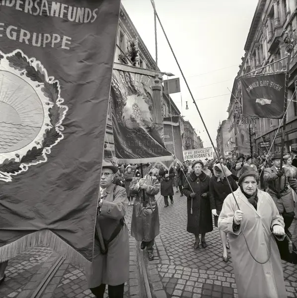 1. mai 1963 i Oslo.Demonstrasjonstoget i Karl Johans gate..Fane: Oslo Arbeidersamfunds Kvinnegruppe.Fane: Simensbråten og omegn kretslag og kvinnegruppe av DNA.Fane: Arbeiderpartiets Kvinnegruppe Vestkanten.Parole: Vi vil beholde Ekebergbanen!