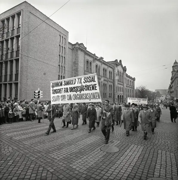 1. mai 1963 i Oslo.Demonstrasjonstoget i Karl Johans gate..Parole : Gjennom samhold til sosial trygghet for drosjesjåførene.Slutt opp om organisasjonen.Parole: Vi krever stabile priser og fortsatt full sysselsetting