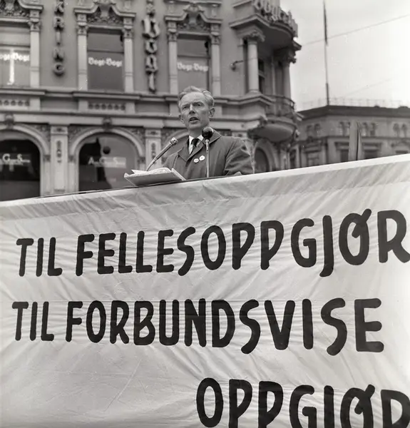 1. mai 1963 i Oslo.Demonstrasjon arrangert av Komiteen for faglig enhet..med støtte av Sosialistisk Folkeparti (SF) og Norges Kommunistiske Parti (NKP).Parole: Nei til fellesoppgjør.Ja til forbundsvise oppgjør.Rolf Nettum taler på Stortorvet..