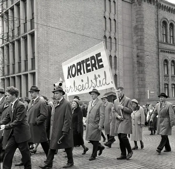 1. mai 1963 i Oslo.Demonstrasjonstog arrangert av Komiteen for faglig enhet med støtte av Sosialistisk Folkeparti (SF) og Norges Kommunistiske Parti (NKP).Parole: Kortere arbeidstid.