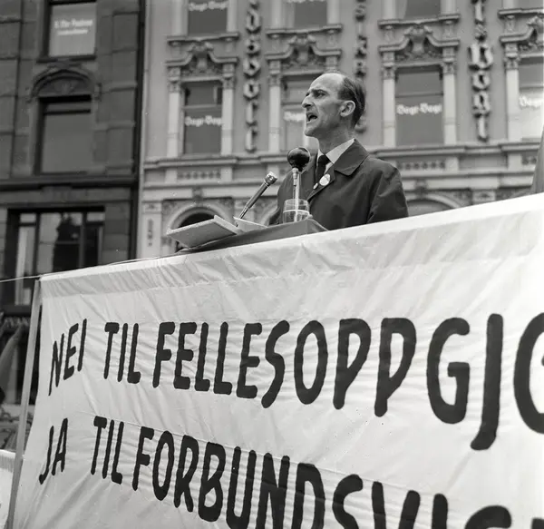 1. mai 1963 i Oslo.Demonstrasjonstog arrangert av Komiteen for faglig enhet med støtte av Sosialistisk Folkeparti (SF) og Norges Kommunistiske Parti (NKP).Parole: Nei til fellesoppgjør.Ja til forbundsvise oppgjør.Finn Gustavsen taler på Stortorvet..