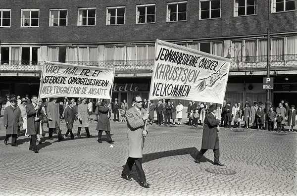 1. mai 1964 i Oslo.Demonstrasjonstoget ved Rådhusplassen.Parole: Jernarbeiderne ønsker Khrustsjov velkommen.Parole: Vårt mål er et sterkere oppsigelsesvern.Mer trygghet for de ansatte