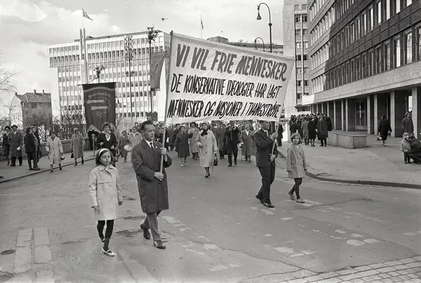 1. mai 1964 i Oslo.Demonstrasjonstoget ved Rådhusplassen.Parole: Vi vil frie mennesker.De konservative ideologier har lagt mennesker og nasjoner i tvangstrøye.