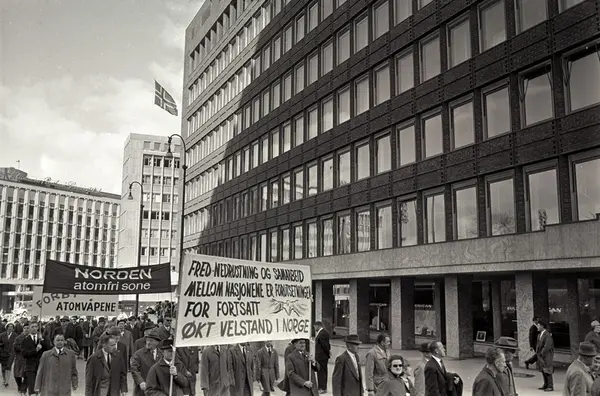 1. mai 1964 i Oslo.Demonstrasjonstoget ved Rådhusplassen.Parole: Fred- nedrustning og samarbeid mellom nasjonene er forutsetningen for fortsatt økt velstand i Norge.Parole: Norden atomfri sone.