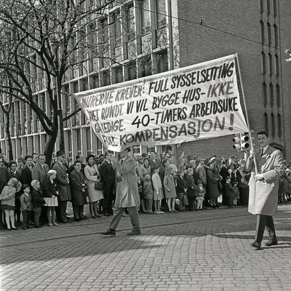 1. mai 1964 i Oslo.Demonstrasjonstoget i Karl Johans gate.Parole: Murerne krever: Full sysselsetting året rundt. Vi vil bygge hus - ikke gå ledige. 40-timer arbeidsuke. Full kompensasjon!.