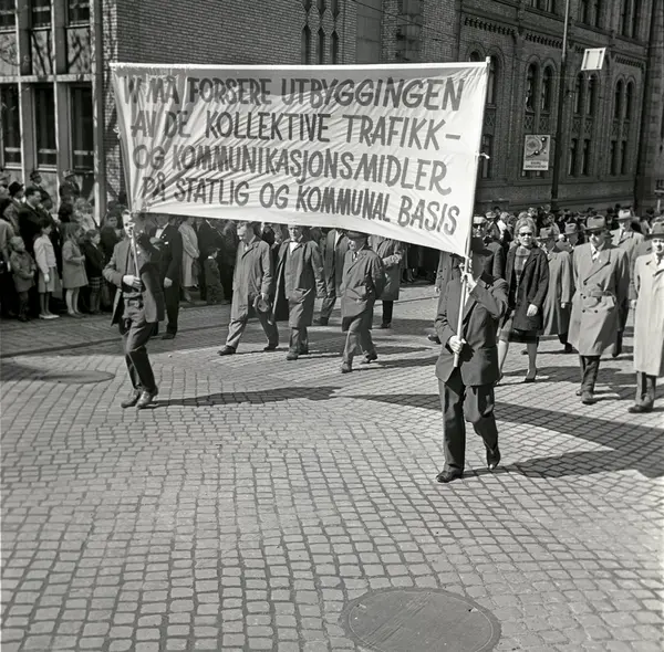 1. mai 1964 i Oslo.Demonstrasjonstoget i Karl Johans gate.Parole: Vi må forsere utbyggingen av de kollektive trafikk- og kommunikasjonsmidler på statlig og kommunal basis