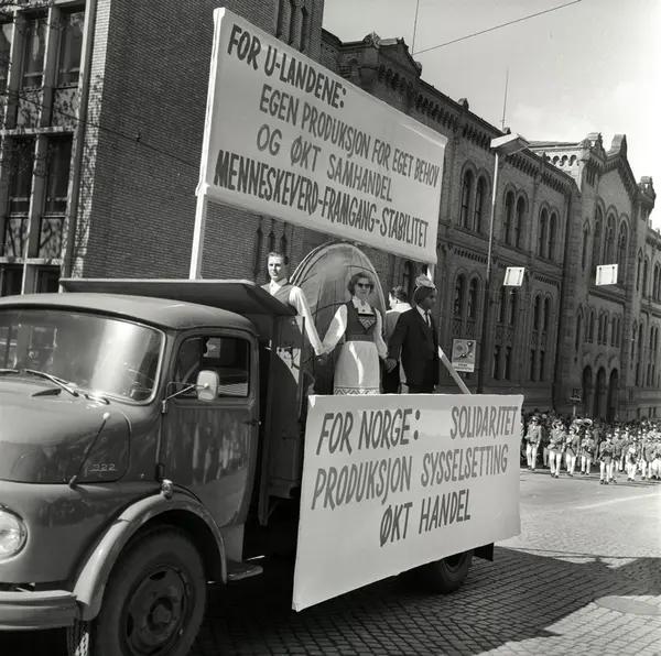 1. mai 1964 i Oslo.Demonstrasjonstoget i Karl Johans gate.Parole: For U-landene:.Egen produksjon for eget behov.og økt samhandel.menneskevern - framgang - stabilitet.Parole: For Norge: Solidaritet produksjon økt handel