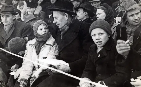 Fra et skøytestevne på Bislett vinteren 1947. Fra venstre: justisminister O. C. Gundersen, Truls og Einar Gerhardsen. På andre rad til høyre, forsvarsminister Jens Christian Hauge.
