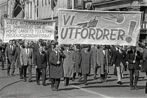 1. mai 1965 i Oslo.Demonstrasjonstoget i Karl Johans gate.Parole: Vi utfordrer!.Parole: Våre vitenskapsmenn til samarbeid om å høyne landets tekniske produksjonsapparat