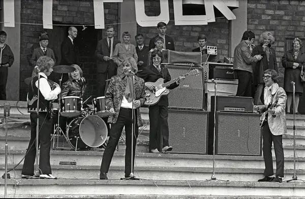 1. mai 1968 i Oslo.Framfylkingens arrangement på Jordal Amfi..The Vanguards spiller.Fra v.: Freddy Lindquist, Leif Hemmingsen, Bjørn Nordvang, Svein Finjarn og Johnny Sareussen