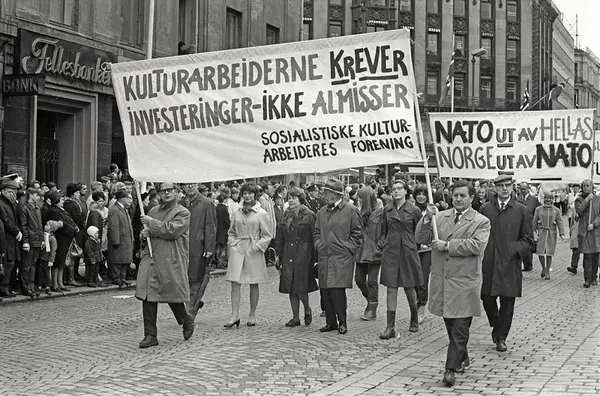1. mai 1969 i Oslo.Demonstrasjonstoget i Karl Johans gate.Parole: Kulturarbeiderne krever investeringer ikke almisser.Sosialistiske kulturarbeiders forening.
