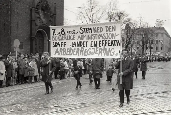 1. mai 1969 i Oslo.Demonstrasjonstoget i Torggata.Parole: 7. og 8. sept.: Stem ned den borgerlige administrasjon -.Skaff en effektiv arbeiderregjering..
