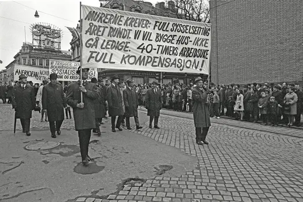 1. mai 1969 i Oslo.Demonstrasjonstoget i Karl Johans gate.Parole: Murerne krever: Full sysselsetting året rundt. Vi vil bygge hus- ikke gå ledige. 40-timers arbeidsuke..Full kompensasjon!