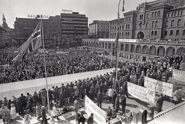 1. mai 1972, Sam.org.`s arrangement på Youngstorget. Parole: Større samfundskontroll over kapitalmidlene. Parole: Ingen tariffavtale før helautomatisk indeksregulering. Parole: Si nei til fullt medlemsskap i EEC 25. sept.