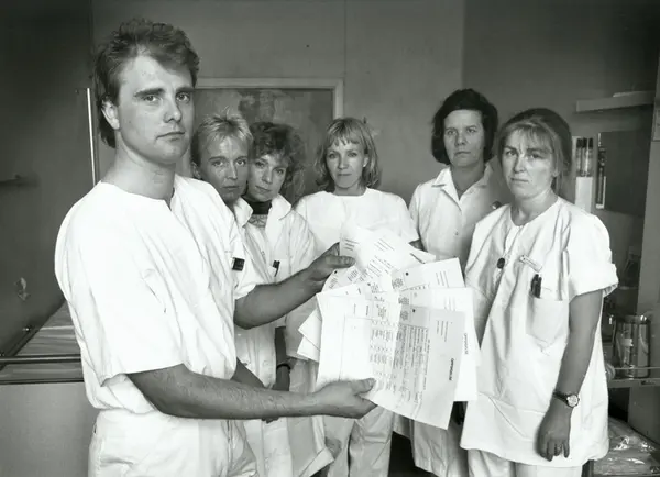 Tariffoppgjøret 1990.Vi sier opp dersom kravene om lavere lønn og lengre arbeidstid går gjennom, sier (fra venstre) sykepleierne Carl Aamodt, Kjerstin Smaavik Johansen, Thorild Ruud, Vigdis Sollid, Anne Aatlo og Siri Gundersen..29. mars 1990.Foto: Arne Ove Bergo