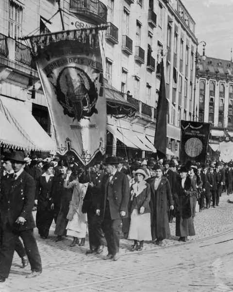 1. mai i Oslo, 1915, toget på vei oppover Karl Johans gate. I forgrunnen avholdsforeningen "Fædrelandets vel" med sin fane, deretter Kristiania Logarveres forening.