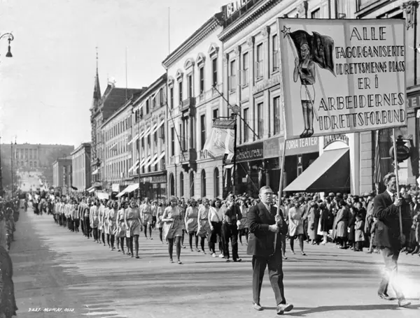 1. mai i Oslo, 1932. Arbeidernes Idrettsforbunds seksjon i.demonstrasjonstoget på vei nedover Karl Johans gate. Parole: Alle fagorganiserte idrettsmenns plass er i Arbeidernes Idrettsforbund.