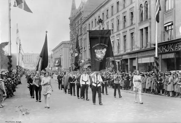 1. mai i Oslo, 1931. Medlemmer av Oslo Arbeideridrettskrets deltar i demonstrasjonstoget bak Arbeidernes Idrettsforbunds fane. .Toget er på vei nedover Karl Johans gate