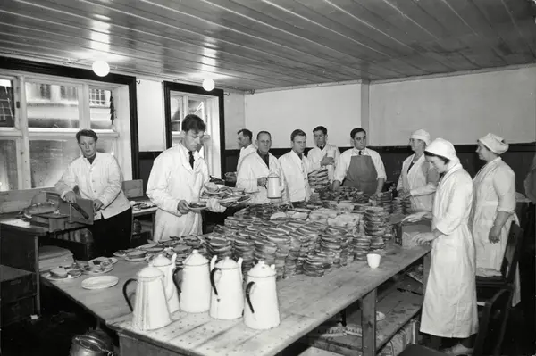 Fra Arbeidsløses Kafe i Rødfyllgaten 12 i Oslo først på 1930-tallet..Serveringen forberedes. Kafeen ble drevet av Oslo faglige.samorganisasjon 1929-1939.