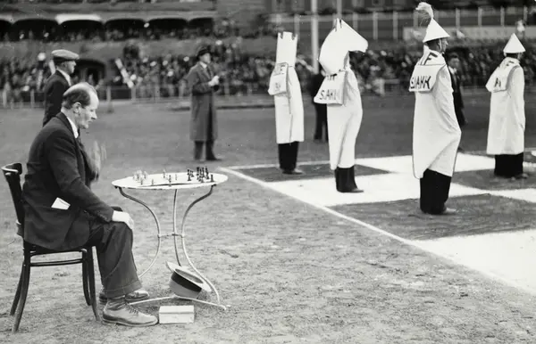 Arbeider- og bondetoget, 2. juni 1935. Fra idrettsstevnet på Bislet om kvelden. Handelsminister Alfred Madsen spiller sjakk med levende brikker. Motstanderen var den senere norgesmesteren i sjakk, Erling Myhre.