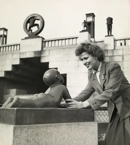 Skuespillerinnen Inger Marie Andersen med en av Gustav Vigelands skulpturer i Frognerparken. I bakgrunnen sees også skulpturen "Mann inne i en ring", fra 1930-31..