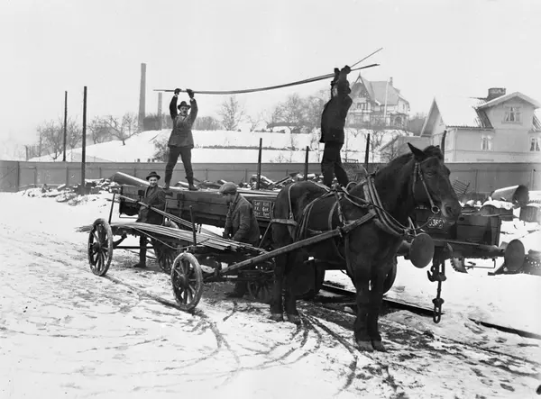 Fra september 1929 til mars 1930 var det streik ved Christiania Spigerverk. Bildet viser ingeniører som laster.stangstål over på ventende jernbanevogner.