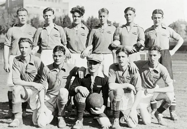 Spigerverkets bedriftsidrettslag i fotball. Oslo-mestere i 1935 og 1937. Helt til venstre i første rad: senere formann for Norsk Jern- og Metallarbeiderforbund og LO-formann Tor Aspengren (1917 - 2004).