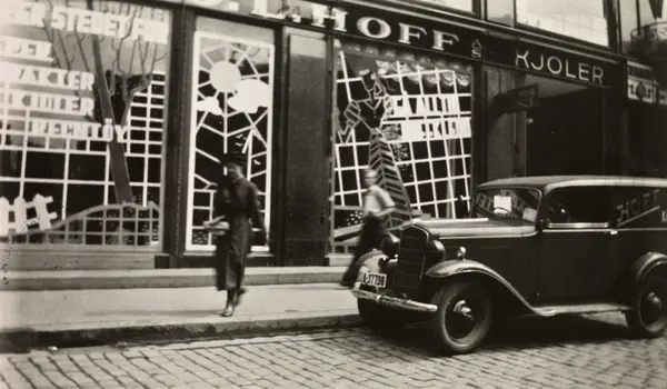 Ole M. Engelsens fotografier fra okkupasjonsårene i Oslo. Slik ble vindusrutene sikret for å hindre at glasset skulle splintres ved flyangrep. Lemmene og sanden skulle gjøre tilfluktsrommene i kjelleren tryggere..Bildet er tatt utenfor Hoff damekonfeksjon i Karls Johans gate 25, mai 1940.